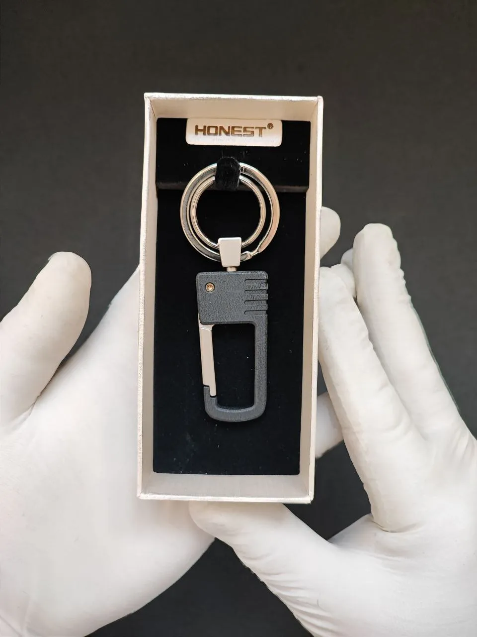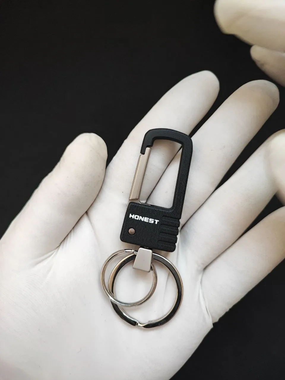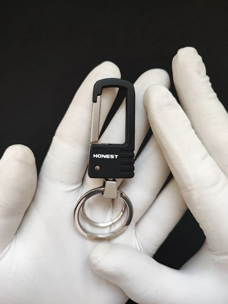 جاکلیدی HONEST با قلاب فلزی مشکی، یک اکسسوری ساده، مقاوم و بسیار کاربردی برای استفاده روزمره است. طراحی مینیمال و رنگ مشکی مات، ظاهر این مدل را شیک و مدرن کرده و برای هر نوع استایلی—از روزمره تا کلاسیک—مناسب است.